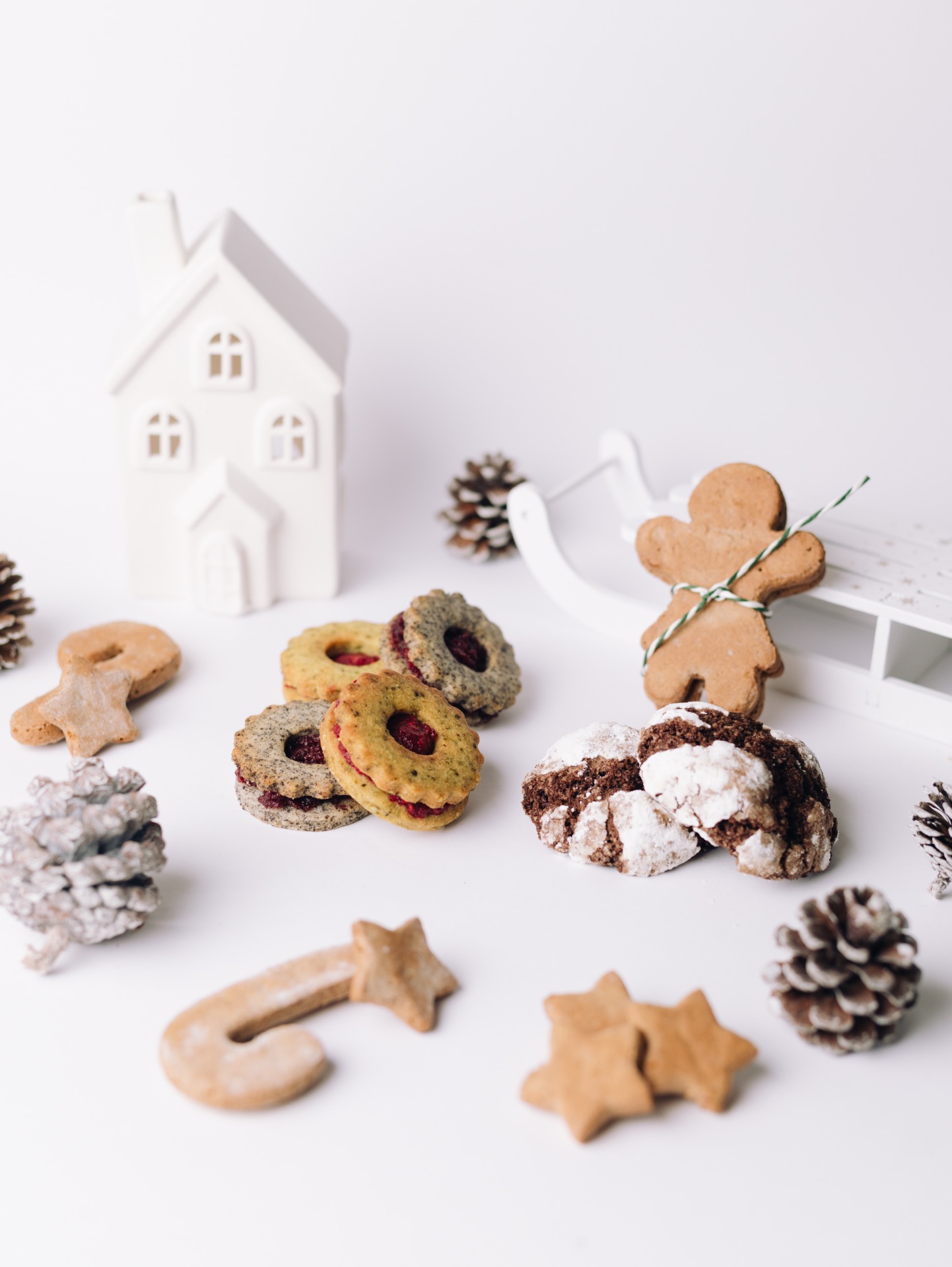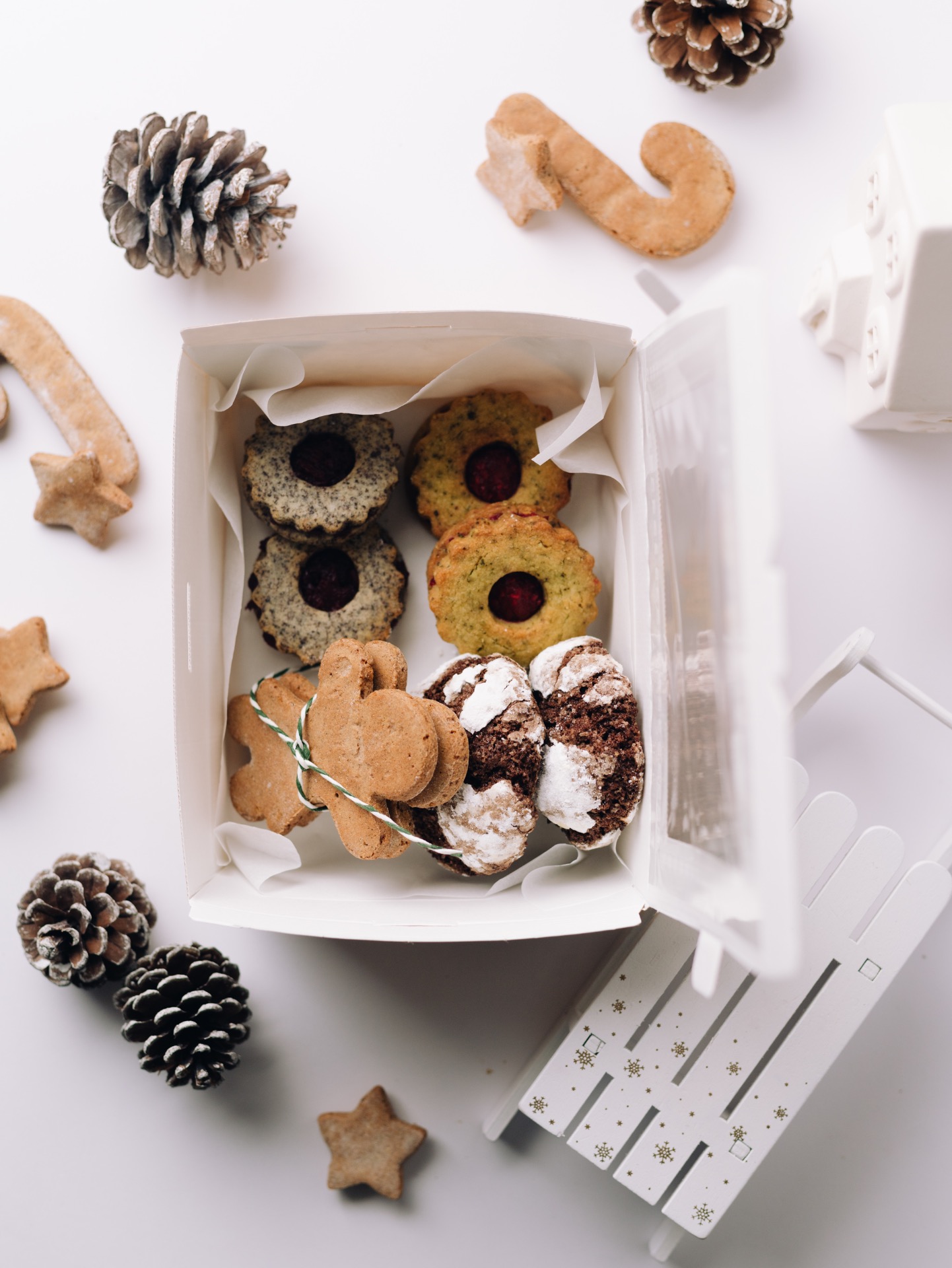 A doboz tartalma: 2 db mézeskalács, 2 db kakaós pöffeteg, 2-2 db meggyes-mákos és tökmagos-málnás linzer.